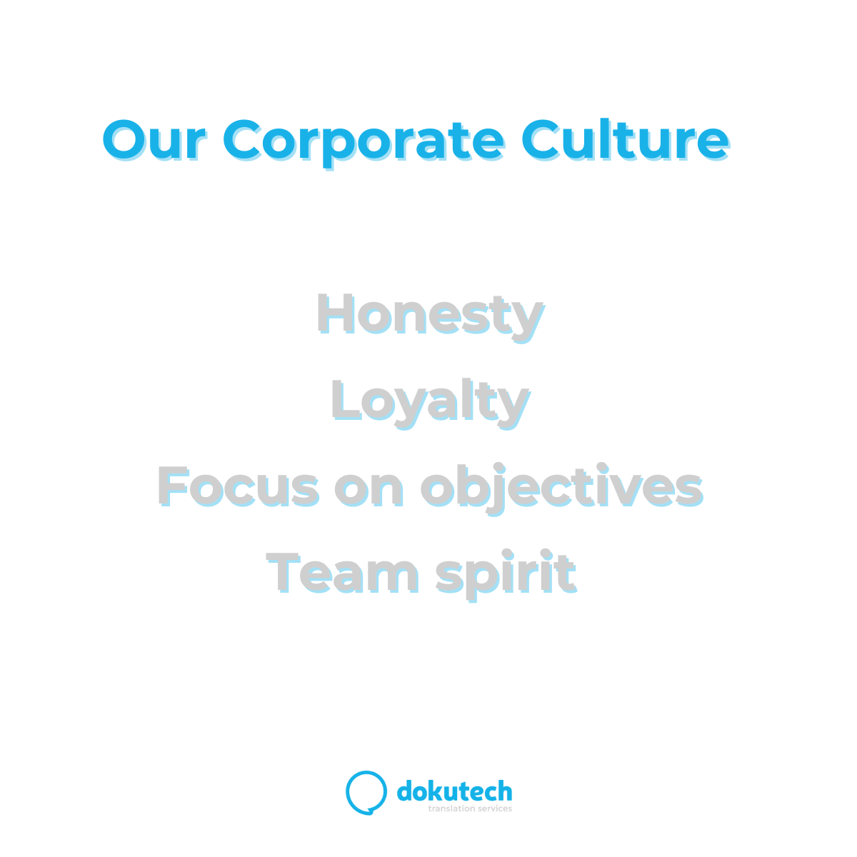 At Dokutech Translations, we believe that our commitment to honesty, loyalty, focus on objectives, and team spirit not only sets us apart in the translation industry but also drives our collective success. These values are the bedrock of our corporate culture and the reason why our clients choose us as their trusted translation partner. As we continue to navigate the challenges and opportunities of the global marketplace, we remain dedicated to these principles, ensuring that we provide unparalleled translation services while fostering a positive impact on the world around us.